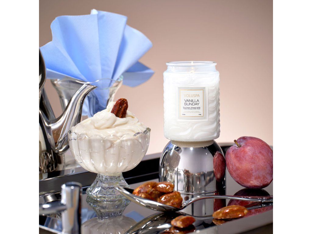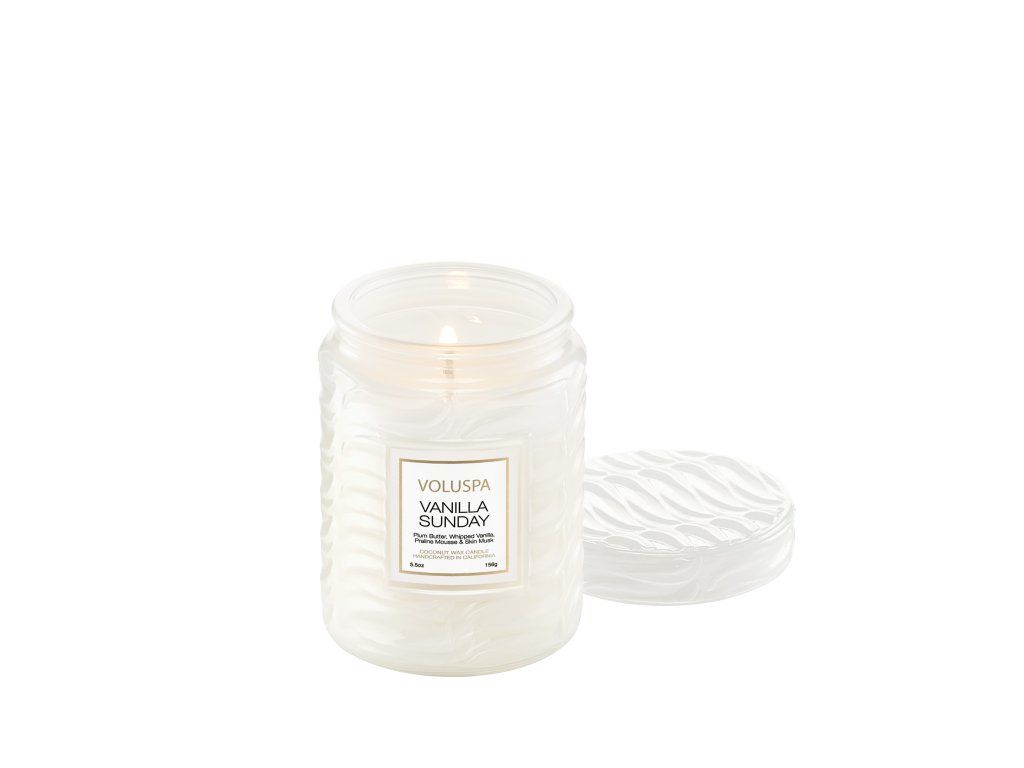 Unikátna zmes kokosového vosku značky Voluspa v modernom sklenenom pohári s reliéfnou textúrou, zabalená v dekoratívnej bielej krabičke. Vďaka 1 knôtu si si môžete vôňu vychutnávať až 50 hodín.