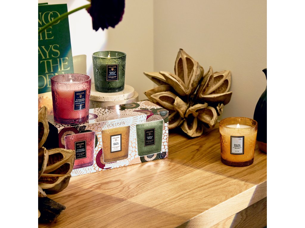 Ručne vyrábané produkty Voluspa sú skutočným klenotom. Vďaka nádherným vôňam s dokonalou parfumáciou, unikátnym a opakovane využiteľným obalom a tiež vďaka obsahu prírodného kokosového vosku.