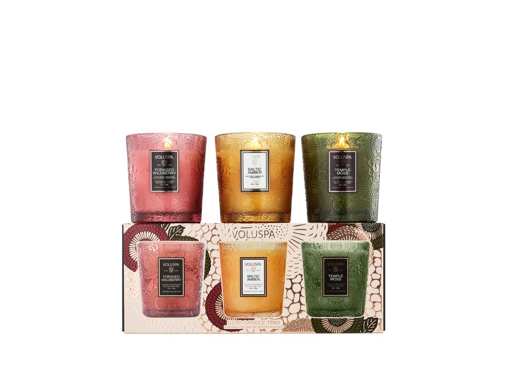 Darčekové balenie obsahuje set troch sviečok: Foraged Wildberry, Baltic Amber, Temple Moss